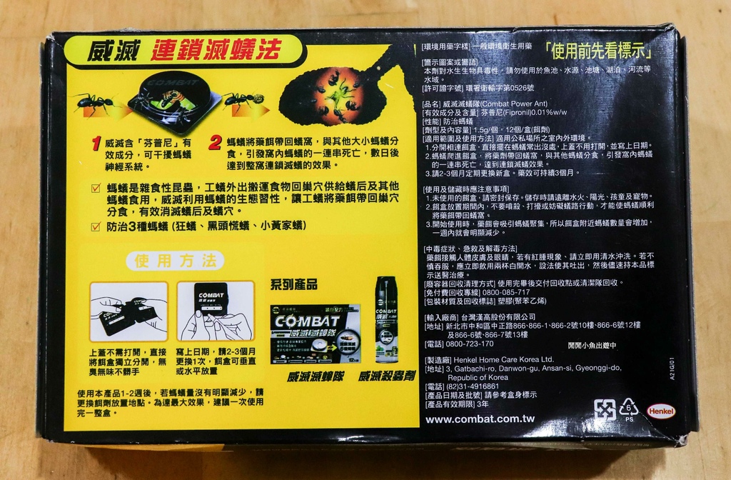 這次一共買了三種產品:Combat威滅滅蟑隊 滅蟑餌盒、Combat 威滅滅蟻隊 滅蟻餌盒、Combat 威滅速效殺蟲劑。